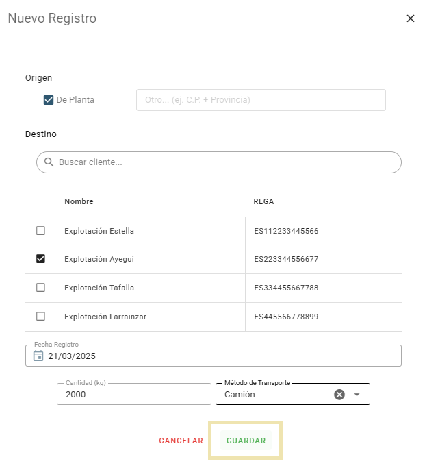 Automáticamente nos aparece una ventana para introducir un “Nuevo registro”. Completamos todos los campos con la información correcta sobre la distribución que se ha vendido.