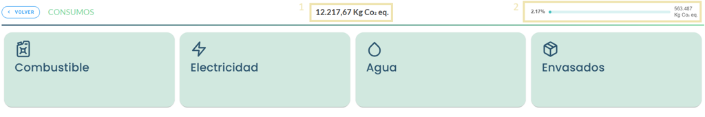 2.En el módulo de consumos se muestra el porcentaje del impacto de consumos en relación con el impacto total de la planta. Este cálculo es clave porque te da una visión clara de cuánto representan los consumos (electricidad, agua, combustibles, envasados) dentro de la huella de carbono general de la planta.