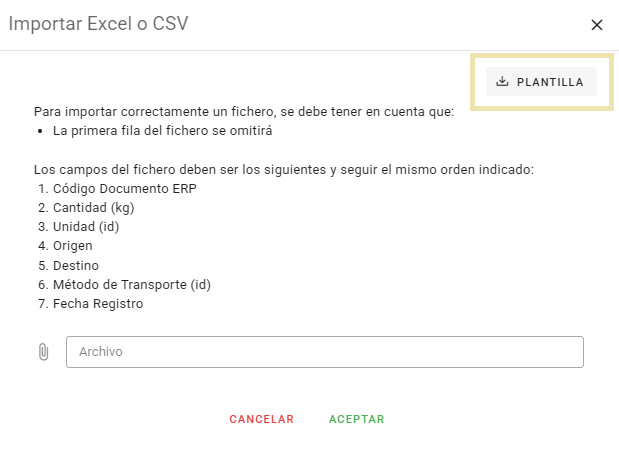 Los campos del fichero deben ser los siguientes y seguir el mismo orden indicado: